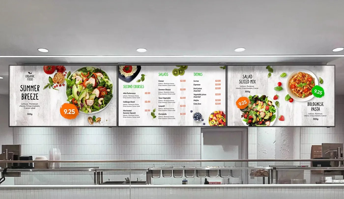 Single and multi-screen digital menu boards for restaurants, cafes, bars, and food service counters. Ceiling-mount, wall-mount, and freestanding options.