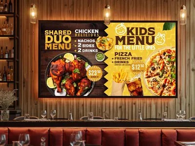 Single and multi-screen digital menu boards for restaurants, cafes, bars, and food service counters. Ceiling-mount, wall-mount, and freestanding options.
